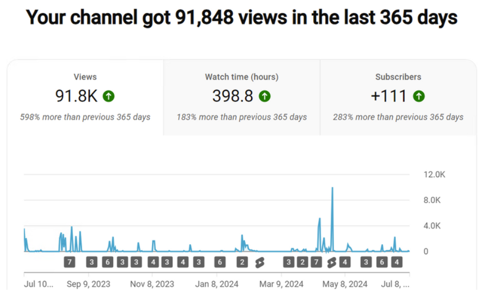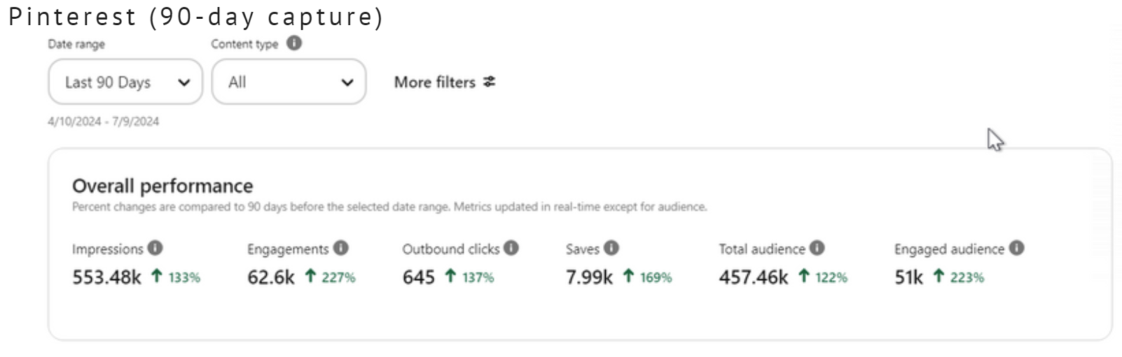 While IG growth stayed relatively flat during her “off season,” we were able to grow her YouTube (without any new videos) and started a Pinterest account to build her blog reach.